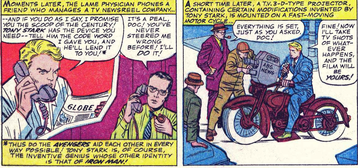 This plan is complicated, but basically he is zipping around New York on a motorcycle mounted with a camera that is projecting a hologram of Thor. This causes the Grey Gargoyle to chase the hologram, which ends with Don Blake driving the motorcycle, and himself, into the Hudson River. Due to some poor judgement, Grey Gargoyle follows close behind: